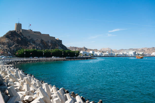 Landscape view of the ancient buildings stretches along the harbor overlooks mountainous rocky formations, Muscat, Oman – December 02, 2018