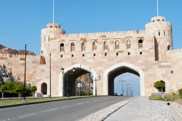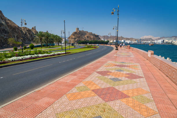 Muscat, Oman – March, 17. 2019 – Al Bahri Road im Muscat along the bay of the Sultan Qaboos Road. The beautiful colorful promenade with a lot of patterns in the bottom is a popular walk for locals and tourists. On the hill the Mutrah Fort